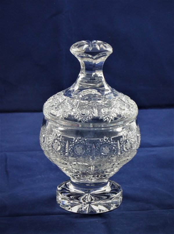 Dose aus Bleikristall, Durchmesser 110mm, Material : Bleikristall mit 24% PbO . Hergestellt nach der klassischen Methode in traditionellen Mustern, mundgeblasen und handgeschliffen mit Steinscheiben. Ohne die Verwendung von automatischen Maschinen oder computergesteuerten Arbeitsschritten. Nach der alten Böhmischen Handwerkskunst, original und fachmännisch Bleikristall zu verarbeiten.