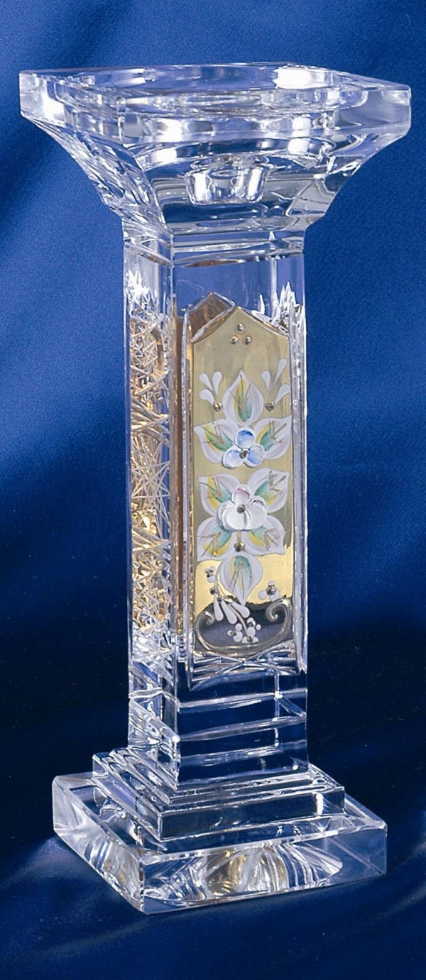 Kristall Kerzenhalter, 230mm hoch, Gold mit Blüten, original Böhmisches Bleikristall mit 24% Pb0, Pariser Schliff, handgeschliffen mit Steinscheiben, mundgeblasen, klassische Form, Böhmische Schule der Kristallkunst.