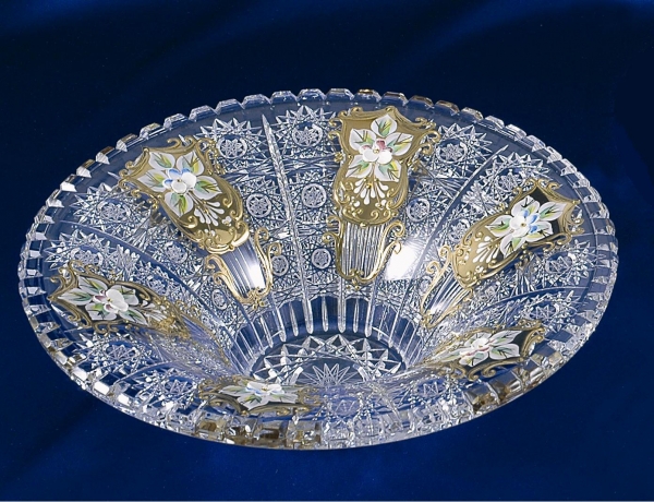 Kristall Schüssel, 300mm Durchmesser, Gold mit Blüten, original Böhmisches Bleikristall mit 24% Pb0, Pariser Schliff, handgeschliffen mit Steinscheiben, mundgeblasen, klassische Form, Böhmische Schule der Kristallkunst.
