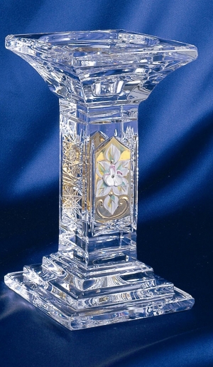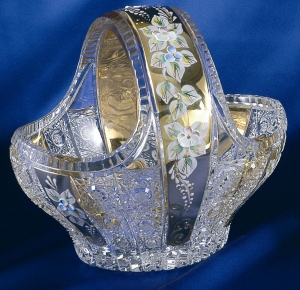 Nachdem schon für die Kristallmodelle nur die besten Glasbläser und ihre Formen für die Rohlinge akzeptabel waren, kommen hier noch die Fähigkeiten des Vergoldens und Blüten-Applizierens hinzu. An der strikten Philosophie ändert sich nichts: keine Pressen, keine Automaten – nur Menschen mit ihrem Talent und steinernen Schleifscheiben. Der Rohstoff ist Bleikristall mit 24% PbO – das ist unser Credo.