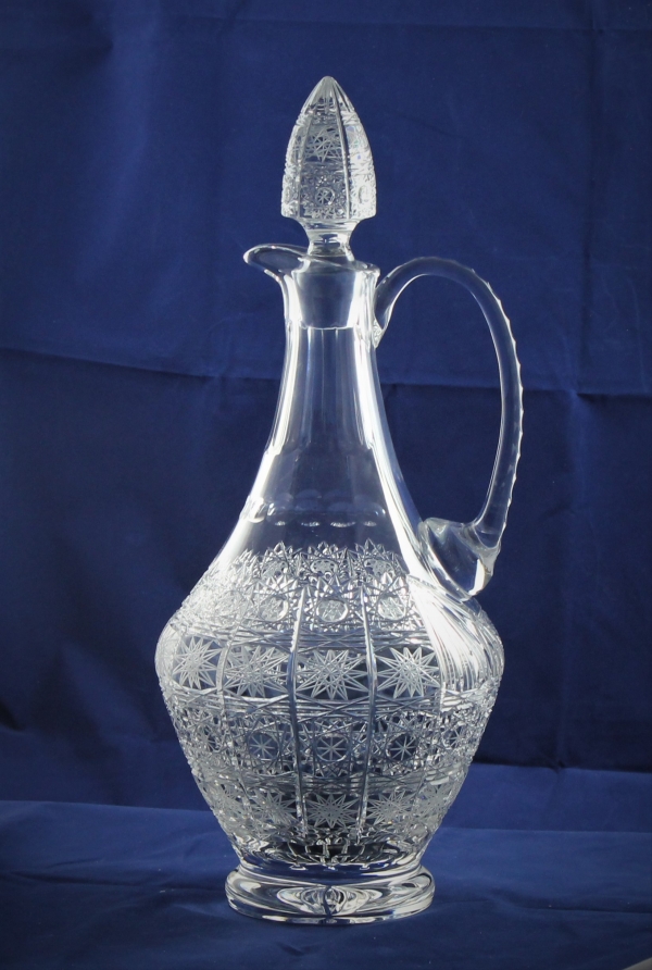 Kristall Karaffe, 1000ml, mit Stöpsel und Griff, Böhmisches Bleikristall, Pariser Schliff, handgeschliffen mit Steinscheiben, mundgeblasen, Böhmische Schule.