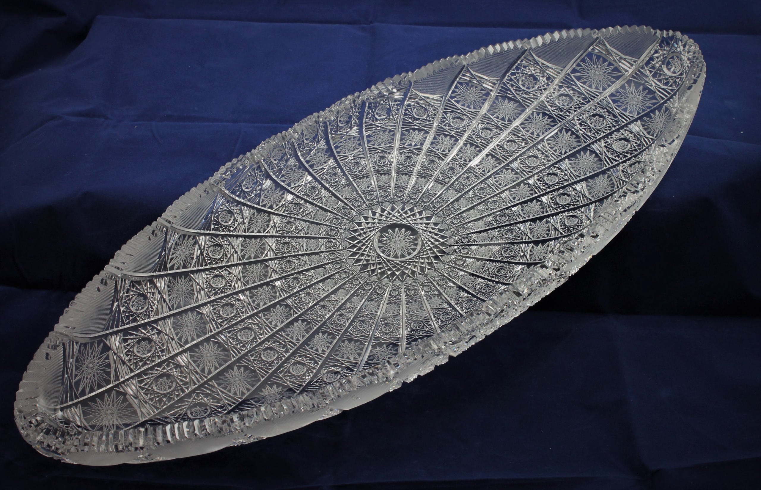 Fischteller aus Bleikristall, Länge 550mm, Material : Bleikristall mit 24% PbO . Hergestellt nach der klassischen Methode in traditionellen Mustern, mundgeblasen und handgeschliffen mit Steinscheiben. Ohne die Verwendung von automatischen Maschinen oder computergesteuerten Arbeitsschritten. Nach der alten Böhmischen Handwerkskunst, original und fachmännisch Bleikristall zu verarbeiten.