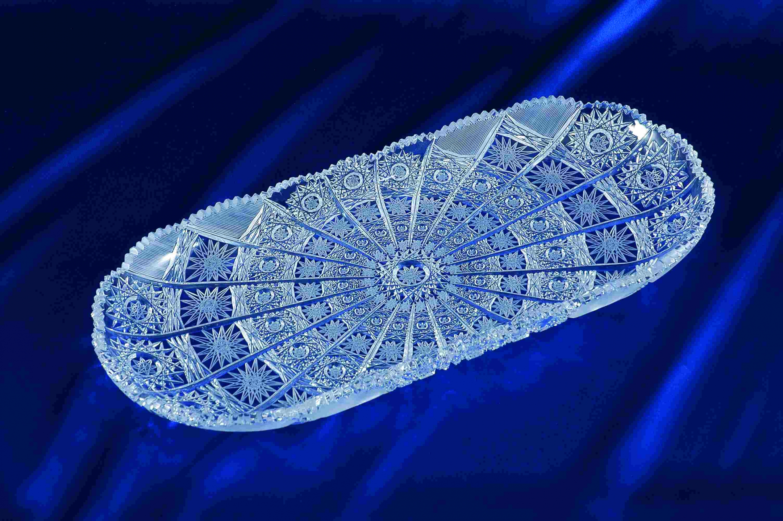 Teller aus Bleikristall, Länge 350mm, Material : Bleikristall mit 24% PbO . Hergestellt nach der klassischen Methode in traditionellen Mustern, mundgeblasen und handgeschliffen mit Steinscheiben. Ohne die Verwendung von automatischen Maschinen oder computergesteuerten Arbeitsschritten. Nach der alten Böhmischen Handwerkskunst, original und fachmännisch Bleikristall zu verarbeiten.