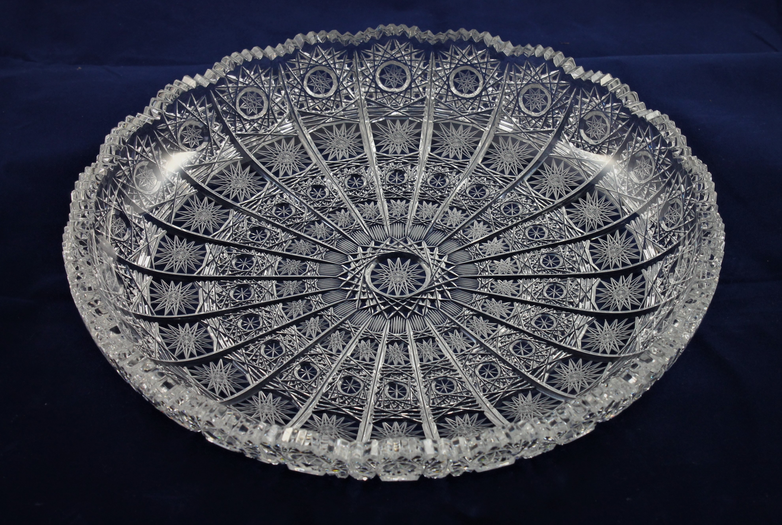 Teller aus Bleikristall, Durchmesser 350mm, Material : Bleikristall mit 24% PbO . Hergestellt nach der klassischen Methode in traditionellen Mustern, mundgeblasen und handgeschliffen mit Steinscheiben. Ohne die Verwendung von automatischen Maschinen oder computergesteuerten Arbeitsschritten. Nach der alten Böhmischen Handwerkskunst, original und fachmännisch Bleikristall zu verarbeiten.